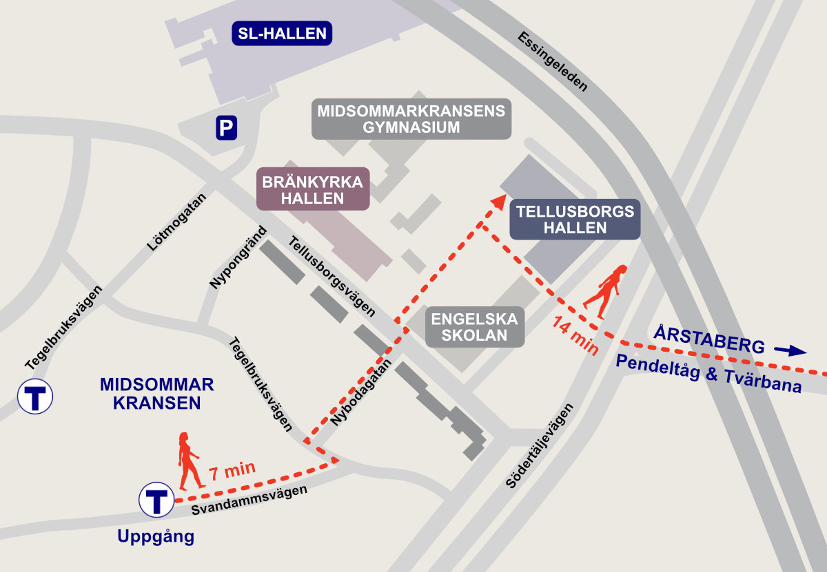 Midsommarkransen (röd linje 14 mot Fruängen), utgång Svandammsvägen, ca 6 minuters promenad till hallen.