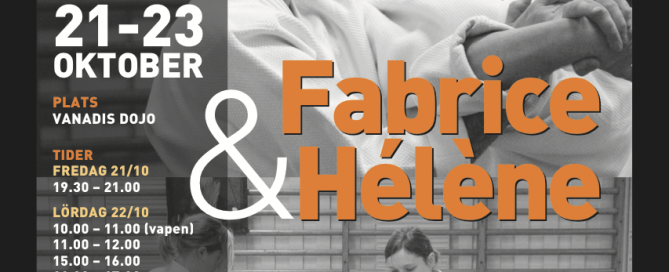 Fabrice Croizé, 5 dan, Hélène Doué, 5 dan, från Paris 21-23 Oktober PLATS VANADIS DOJO TIDER FREDAG 21/10 19.30 – 21 LÖRDAG 22/10 10.00 – 11.00 (vapen) 11.00 – 12.00 15.00 – 16.00 16.00 – 17.00 SÖNDAG 23/10 10.00 – 11.00 (vapen) 11.00 – 12.00 PRIS HELA LÄGRET: 500 KR PER TIMMA: 200 KR Information: Katarina Gullberg • e-mail: katarina.gullberg@gmail.com